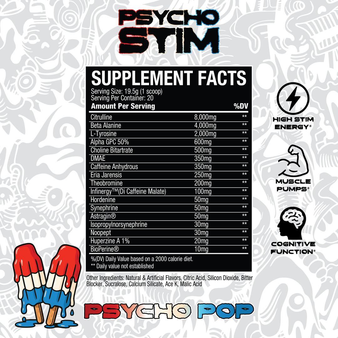 Psycho Stim was created to be a high-stimulant pre-workout formulated for intense energy, laser focus, and extreme performance enhancement. It’s loaded with nootropics, stimulants, and pump agents designed to push both mental and physical limits in the gym.